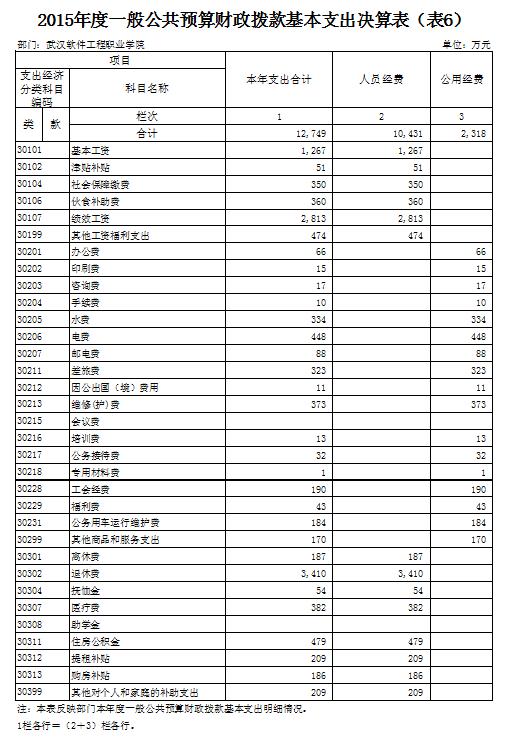 2015度一般公共预算财政拨款基本支出12749万元,其中,人员经费10432万元,主要包括:基本工资、津贴补贴、社会保障缴费、绩效工资、其他工资福利支出、离休费、退休费、抚恤金、医疗费、助学金、住房公积金、提租补贴、购房补贴、其他对个人和家庭的补助支出等;公用经费2318万元,主要包括:办公费、印刷费、咨询费、手续费、水费、电费、邮电费、差旅费、因公出国(境)费、维修(护)费、会议费、培训费、公务接待费、专用材料费、工会经费、福利费、公务用车运行维护费、其他商品和服务支出、办公设备购置、专用设备购置、信息网络及软件购置更新等。