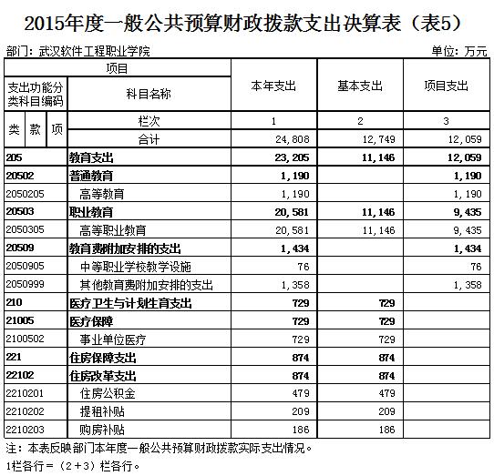 2015年一般公共预算财政拨款支出年度预算为27453万元,支出决算为24808万元,完成年度预算的90.37%。其中:基本支出12749万元,项目支出12059万元。项目支出主要用于校园数字化建设750万元;重点学科及品牌专业建设1100万元;教育教学基础设施建设3896万元;校舍空调购置500万元;国家骨干高职院校专项建设1453万元、普通高校国家资助资金、高校学生服义务兵役学费资助等专项资金1388万元;校园文化建设500万元;各类专项和补助资金2472万元等。