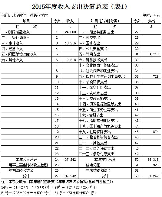 2015年度收入总计37242万元,支出总计36316万元。与2014年相比,收入增加5692万元,增长18.04%,主要原因是增加了学院建设专项拨款及学费收入。支出增加9241万元,增长34.13%,主要原因是增加了国家骨干高职院校专项建设支出。