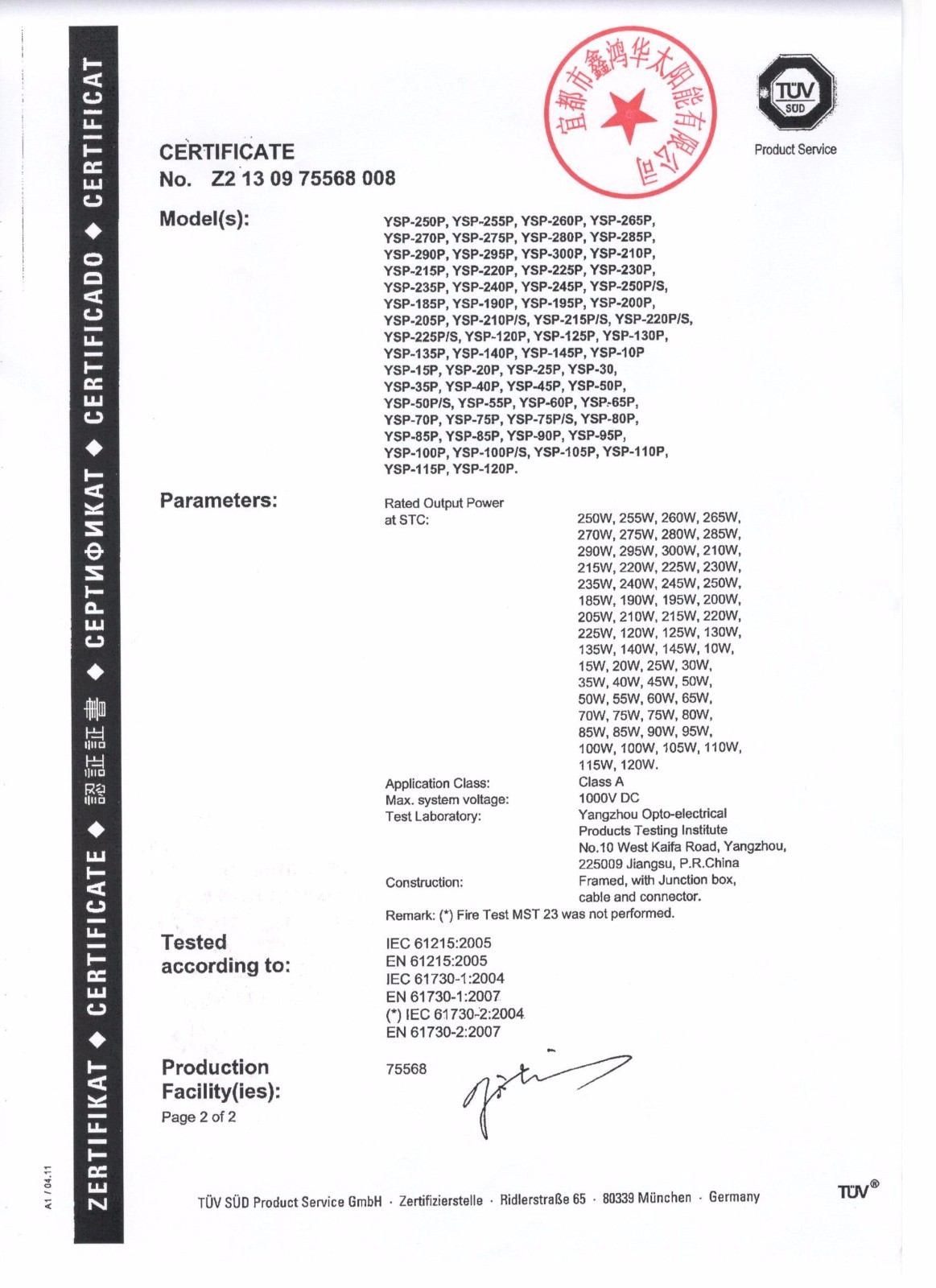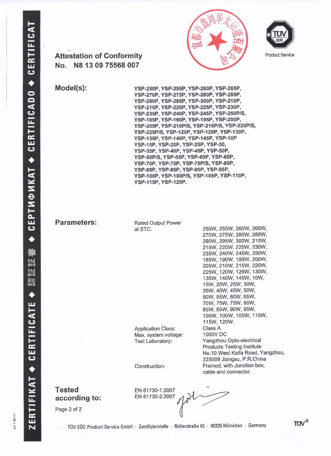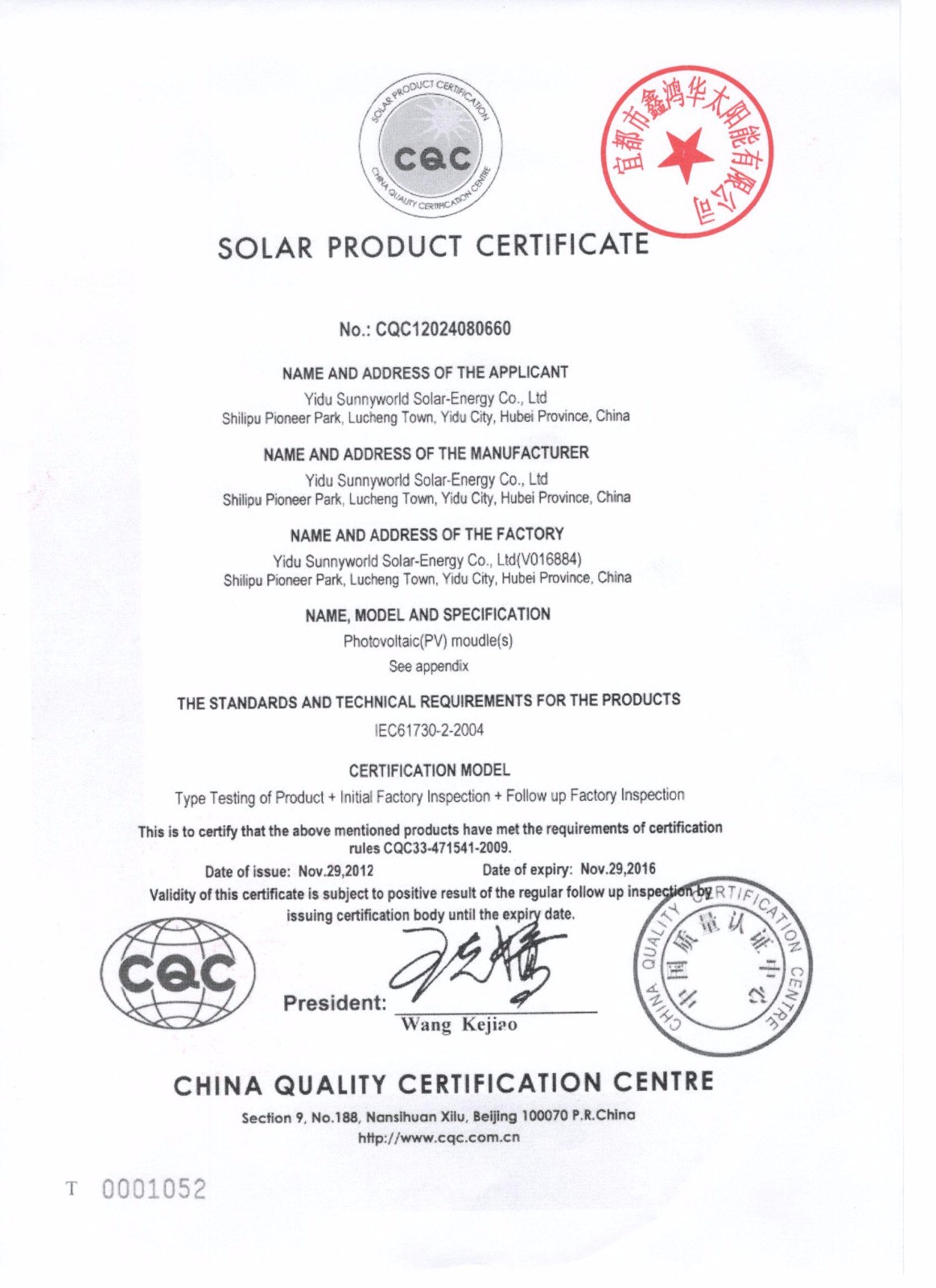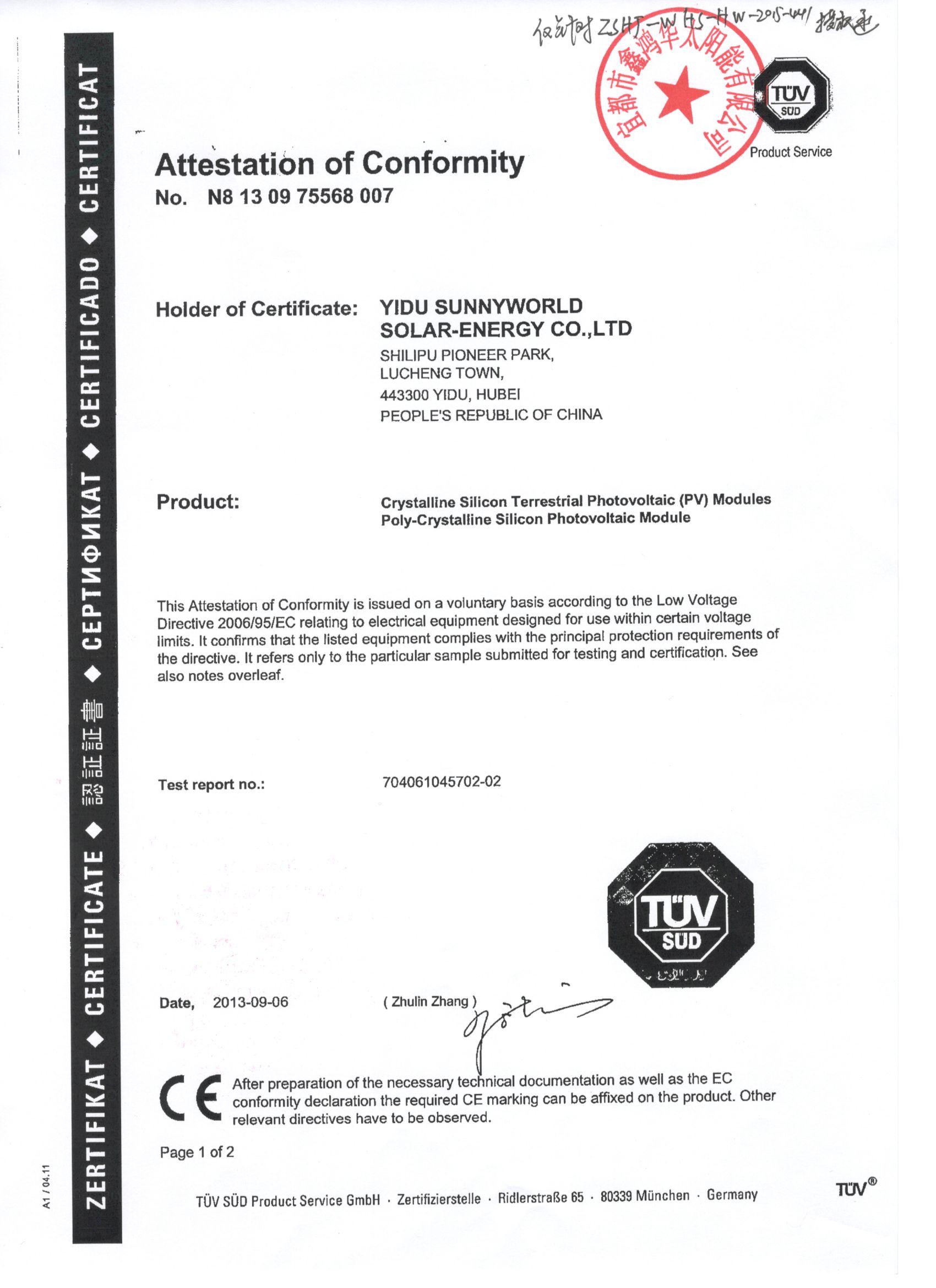 分布式光伏发电项目太阳能电池板验收合格证书