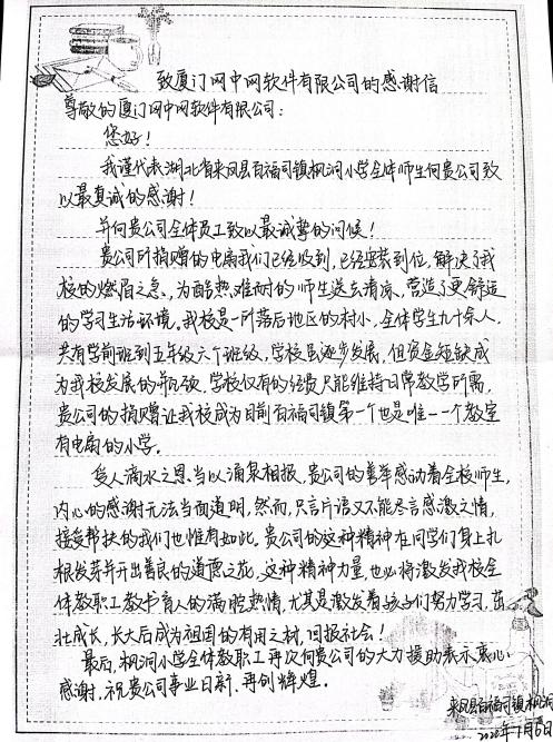 高温时节,学校驻廖家坝村工作队深入开展党员干部“下基层、察民情、解民忧、暖民心”实践活动,一方面利用乡村振兴帮扶资金购买落地扇送往枫洞小学,另一方面呼吁社会力量关心支持乡村小学的建设发展,改善孩子们的学习环境。我校校企合作企业厦门网中网软件有限公司知悉后,主动联系驻村工作队向枫洞小学捐赠10台吊扇,近日送到枫洞小学并已全部安装使用。我校一直深化产教融合、校企合作,并且十分重视发挥校企的社会效益,为山区学校的发展贡献力量。