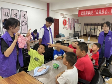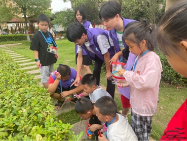 团队成员精心设计了自然科学课,带领孩子们动手制作“吸尘器”“造雪机”“滑行飞机”“扫地机器人”,让孩子们在创造中探索问题;在文化传承板块中,教孩子们制作“水果茶冻”“七夕许愿灯”,在劳动中融入思政元素,感受中国传统文化的魅力所在;在研学益行板块中,带领孩子们来了一场野趣探索,在草丛、树梢、灌木里观察生活中的动植物“朋友”,让孩子们保持探索世界的好奇心;在红色基因板块中,和孩子们观看儿童红色穿越剧《再见!王二小》,牢记为国牺牲的英雄们,传承红色基因。团队成员丁雨晴在实践活动结束时说:“我们能够做的其实很少,但给孩子们带去欢乐幸福的同时自己也收获了更多的东西。”