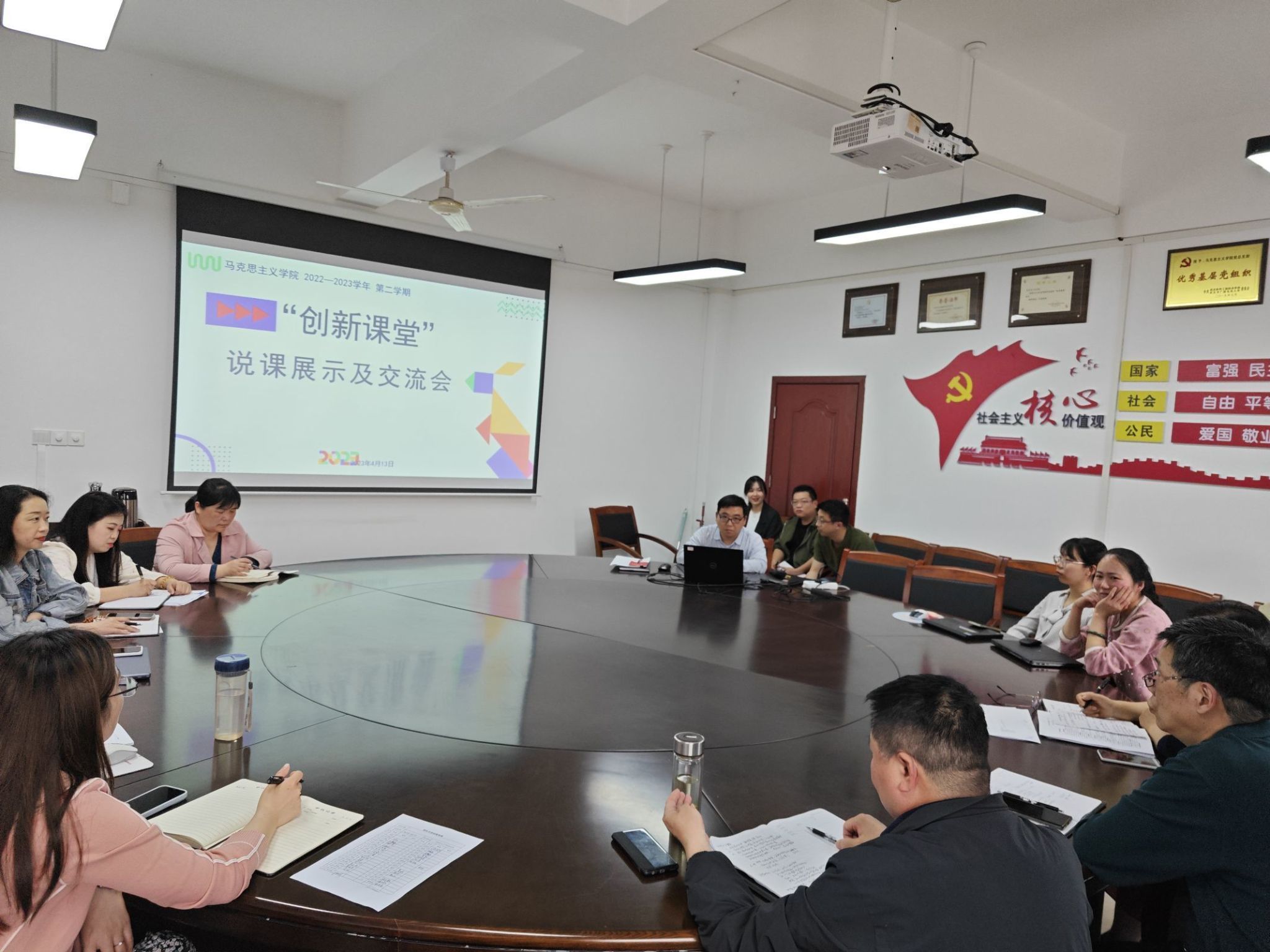 (通讯员:刘逸夫)为进一步推进思政课教学改革创新,促进全院教师互学共研、互鉴共进,马克思主义学院于4月13日下午开展“创新课堂”说课展示及交流活动,学院领导和全院教师参加交流学习。会议由肖国香副院长主持。