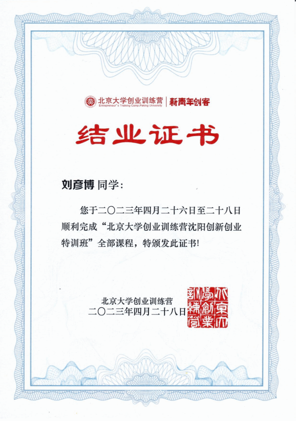 近日,我校中小创 2101 班学生刘彦博经过网络报名一初审一复审一录取,成功入选“北京大学创业训练营沈阳创新创业特训班”。
