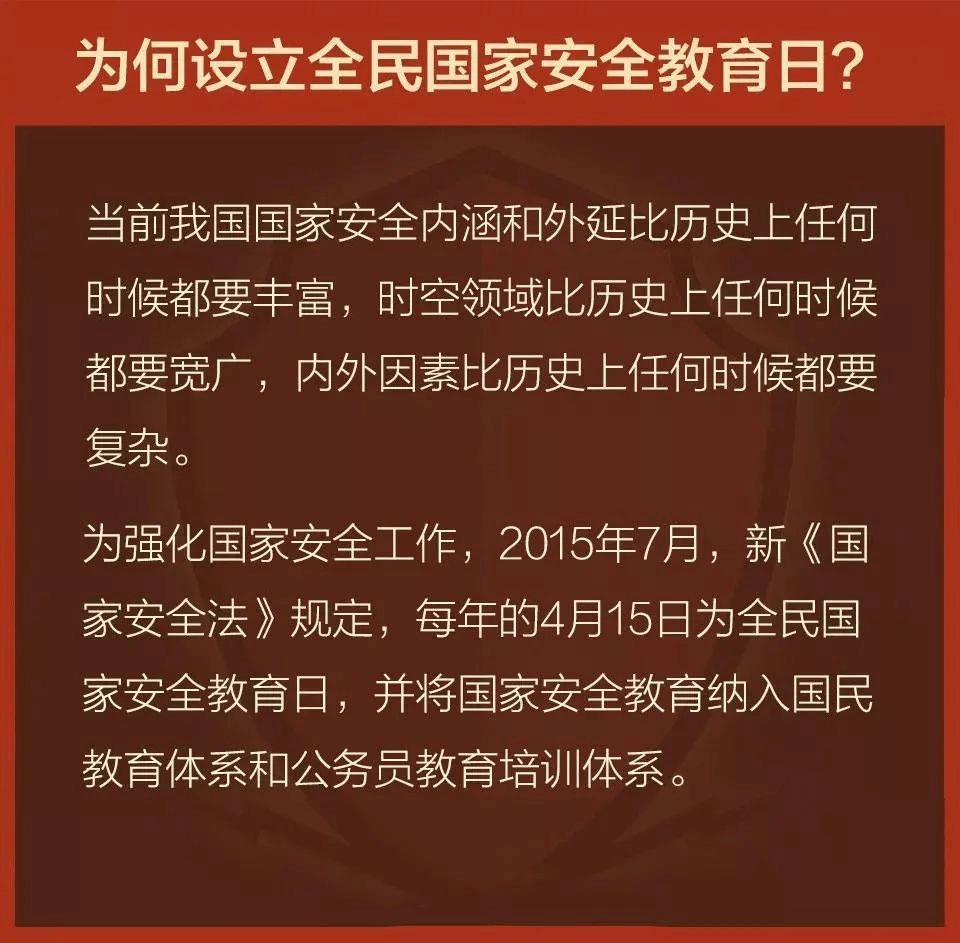 2023年4月15日,是第8个全民国家安全教育日,主题是“贯彻总体国家安全观,增强全民国家安全意识和素养,夯实以新安全格局保障新发展格局的社会基础”。