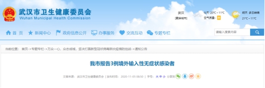 据武汉市卫健委官网消息:2020年11月4日0-24时,我市报告3例境外输入性无症状感染者,均为10月30日晚乘坐印度航空AI1314航班飞抵武汉天河机场的乘客。3人在集中隔离期间例行核酸检测结果为阳性,转至市金银潭医院隔离诊疗。综合流行病学史、临床症状、实验室检测和影像学检查结果等,经专家会诊,诊断为境外输入性无症状感染者。
