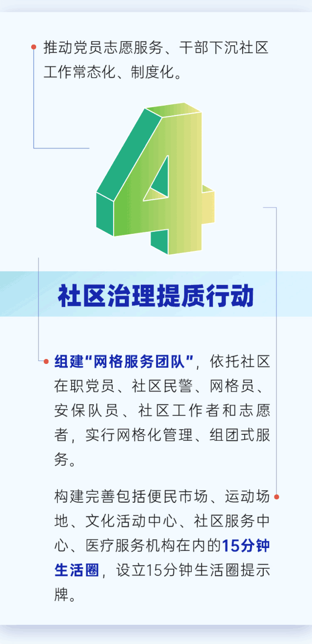 其中,围绕疫情防控新形势和居民群众新需求,健康生活倡导行动和社区治理提质行动因势制宜提出了具体可行的操作。健康生活倡导行动倡导推行“分餐制”,提倡分餐公筷公勺等就餐方式,并且倡导勤洗手、多通风、“一米线”等良好习惯,普及健康生活常识,推广文明生活习惯,引导市民养成文明健康的生活方式。社区治理提质行动则提出构建完善包括便民市场、运动场地、文化活动中心、社区服务中心、医疗服务机构在内的15分钟生活圈,设立15分钟生活圈提示牌,着力打通市域社会治理的“最后一公里”。