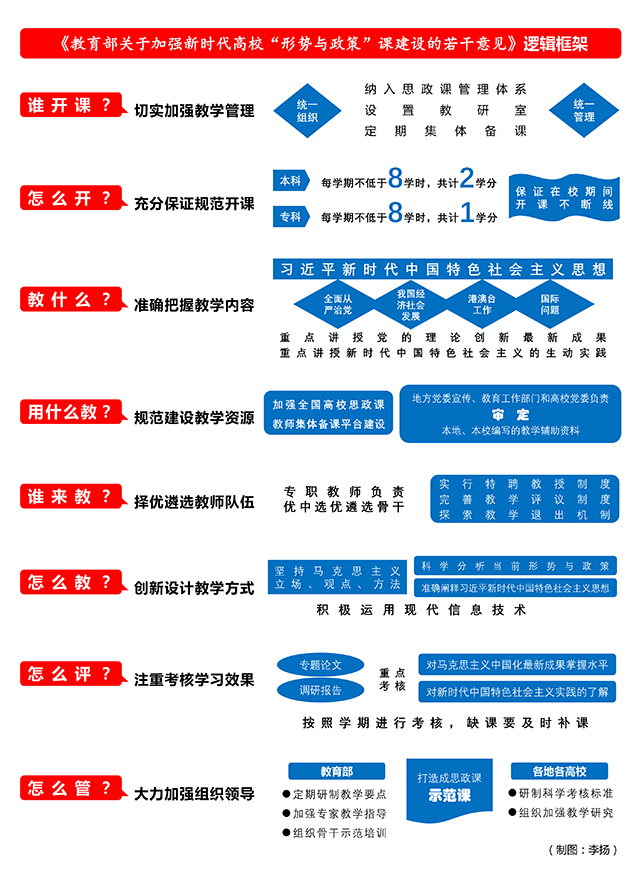 《意见》按照“短、实、新”的思路,重点从“谁开课、怎么开、教什么、用什么教、谁来教、怎么教、怎么评、怎么管”八个方面对新时代高校“形势与政策”课建设提出明确要求。《意见》要求将“形势与政策”课纳入思政课管理体系,纳入学校教学计划,由学校思政课教学科研二级机构统一组织开课、统一管理任课教师。要保证本、专科学生在校学习期间开课不断线,覆盖所有本科生,本科每学期不低于8学时,共计2学分;专科每学期不低于8学时,共计1学分。要紧密围绕学习贯彻习近平新时代中国特色社会主义思想,把坚定“四个自信”贯穿教学全过程,开设好全面从严治党、我国经济社会发展、港澳台工作、国际形势与政策四大类专题。各高校要积极参与、共建共享,共同打造“形势与政策”课教学优质资源。要配备高素质的专职教师负责“形势与政策”课组织工作,按照“优中选优”的原则遴选骨干教师,实行特聘教授制度。强调可采取灵活多样的方式组织课堂教学,积极运用现代信息技术手段。要注重考核学生对马克思主义中国化最新成果的掌握水平,考核学生对新时代中国特色社会主义实践的了解情况。各地各高校要组织教师及时关注形势与政策变化,学深悟透习近平新时代中国特色社会主义思想,把“形势与政策”课打造成推动党的理论创新最新成果第一时间进课堂的示范课。