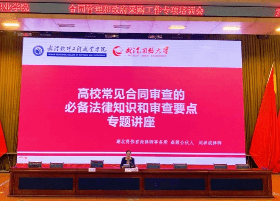 为进一步提高学校合同管理水平,提升教职工法律风险防范意识,更好地推动审计问题整改,3月30日下午,学校邀请湖北得伟君尚律师事务所高级合伙人刘祥斌律师、湖北省政府采购协会规划部部长印鹏,分别就《高校常见合同审查的必备法律知识和审查要点》《政府采购合同管理注意事项》主题进行专门的讲座培训。讲座由副校长孙美华主持。全校科级以上干部、教研室主任共220余人参加,对合同管理及政府采购有关规定有了更为全面、深入的理解,提高了相关法律知识水平,对树立全员风险管理意识起到积极作用。