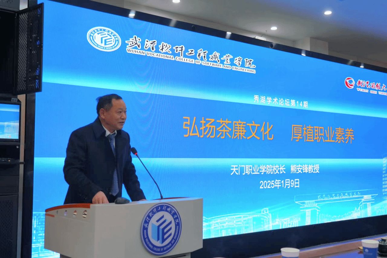 (通讯员 代涵鲜于)1月9日下午,第十四期 “秀湖学术论坛” 在学术楼 4 号厅举行,天门职业学院校长熊安锋、茶文化教研室主任何杨担任主讲嘉宾,围绕茶廉文化展开深入探讨,讲座由副校长王中林主持,百余名教师齐聚一堂,共赴这场茶文化盛宴。