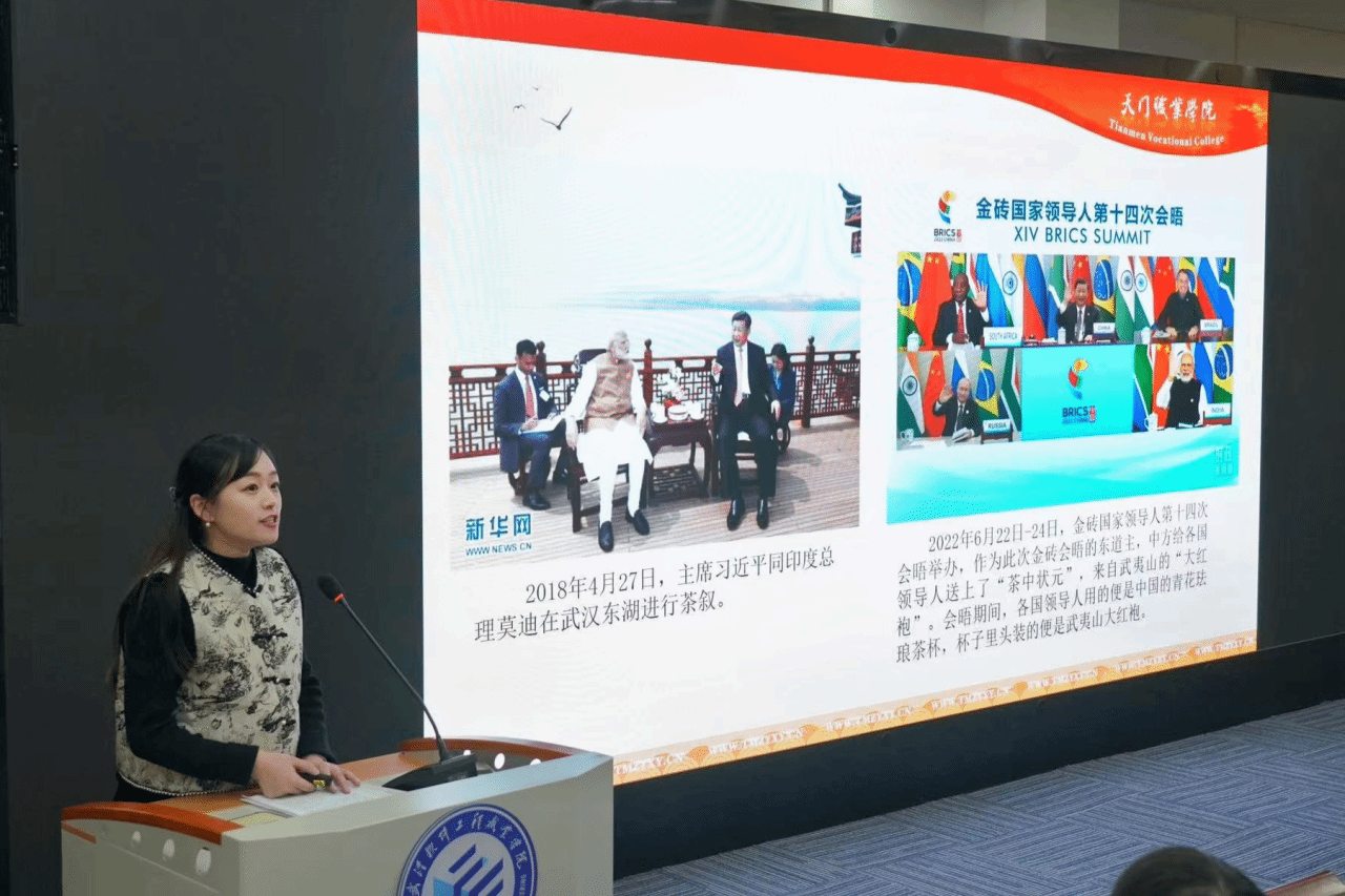 天门职业学院茶文化教研室主任何杨作题为“清茗传雅颂,千淬承万代”专题讲座。何老师以茶为媒介,从“慢溯茶史”“学茶知礼”“饮茶有道”等几个方面娓娓道来,用生动的文化故事深刻讲解“廉、美、和、敬”的茶文化,带大家走进茶香四溢的世界,感受茶文化的魅力与韵味。