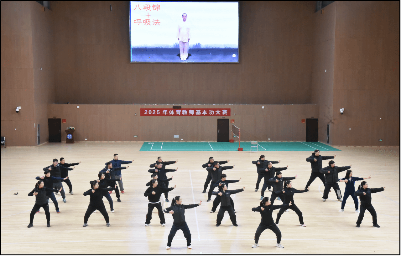 展示中,教师们整齐展示了健身气功-八段锦、队形队列等基本功,动作熟练、气势昂扬。