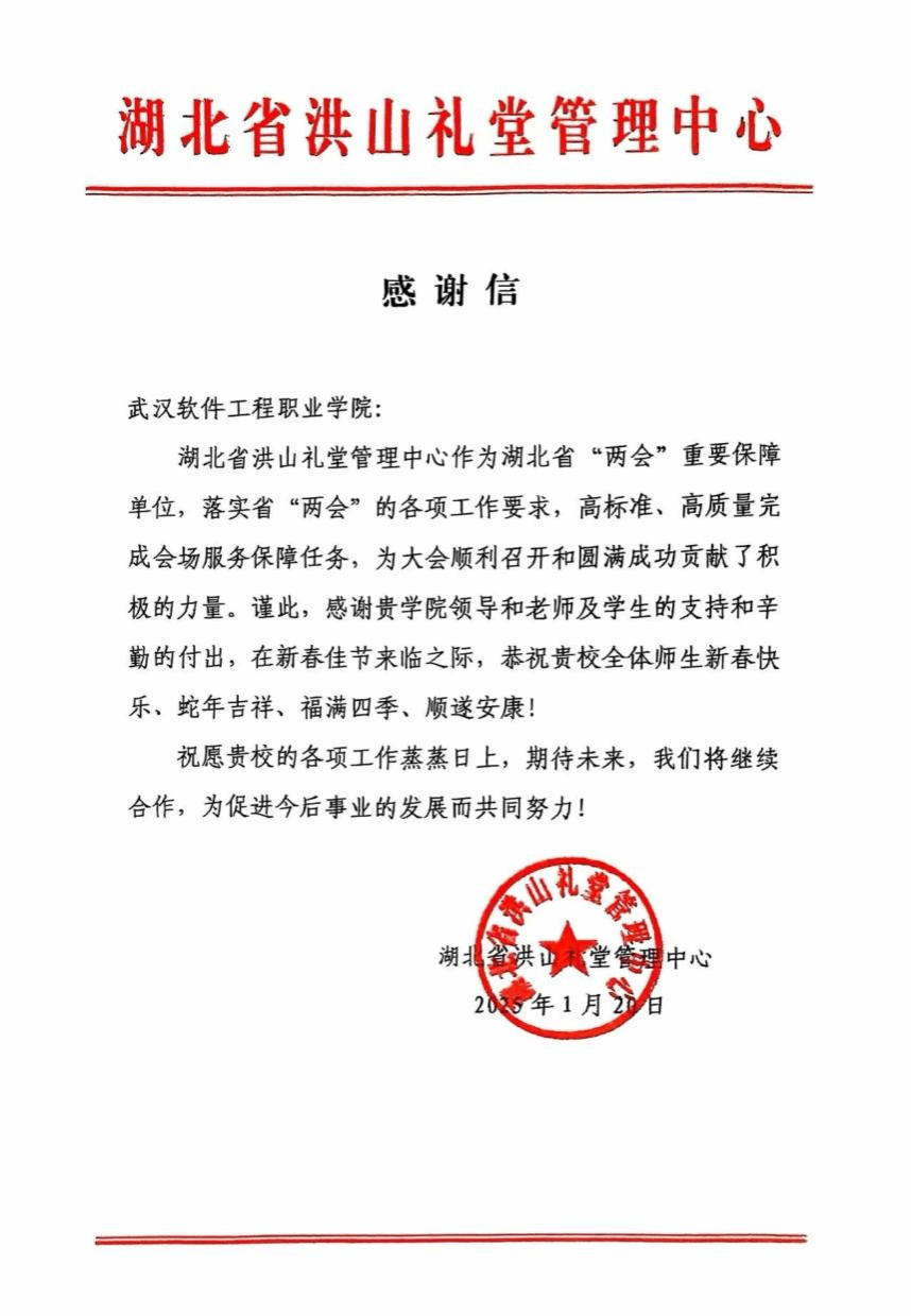 (通讯员 胡倩)近日,湖北省十四届人大三次会议、湖北省政协十三届三次会议在武汉胜利落下帷幕。我校文化旅游学院的礼仪志愿者凭借出色的表现,圆满完成了大会服务保障任务,并收到了来自湖北省洪山礼堂送来的感谢信。