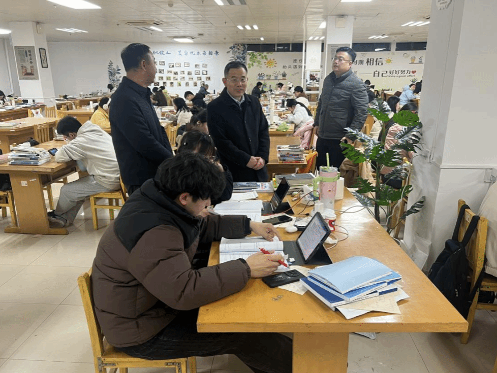 在图书馆,校领导一行了解学生学习自习情况。同时,领导们与各学院值班辅导员进行深入交流,详细了解近期学生思想生活动态、并听取值班辅导员对于学生社区管理与服务工作的意见和建议。