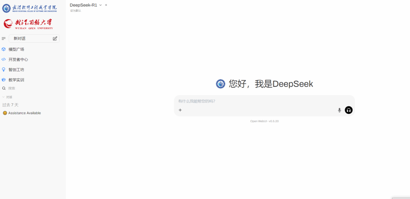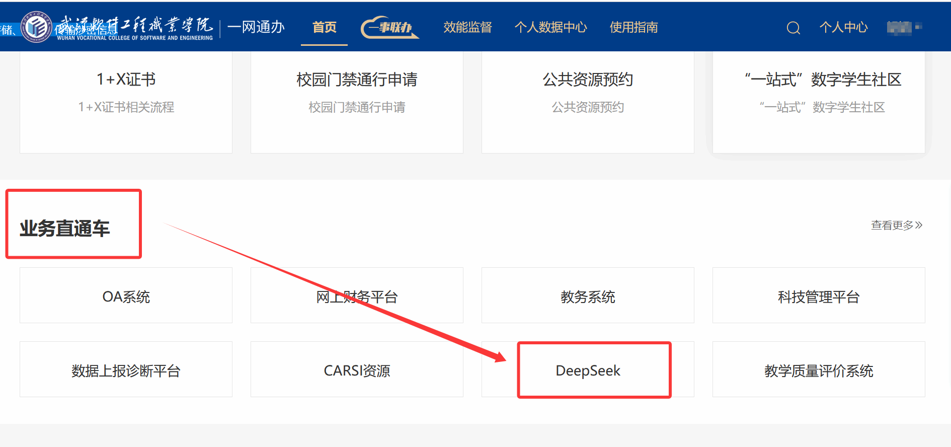 目前,DeepSeek -R1已成功实现本地部署,并顺利通过测试。试运行阶段仅限于校内访问,教职工登陆 “一网通办”主页(https://one.whvcse.edu.cn/),点击“直通车”栏目的“DeepSeek”图标,即可使用。
