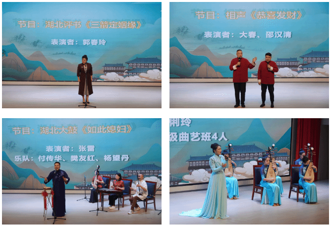 武汉市艺术学校23级曲艺班学生以群口快板《支点建设谱华章》开场,洋溢着青春活力的表演赢得满堂喝彩;武汉说唱团副团长郭春玲演绎的湖北评书《三箭定姻缘》声情并茂,展现传统说唱艺术的魅力;大春、邵汉清带来的相声《恭喜发财》妙语连珠,引得观众笑声不断;张雷携乐队表演的湖北大鼓《如此媳妇》诙谐生动;李聪、李晶伦的相声《爷爷的战争》则以温情叙事打动人心;压轴节目湖北小曲《过早》《黄鹤楼》由国家一级演员、中国曲艺牡丹奖获得者姚俐玲领衔演绎,她婉转唱腔勾勒出武汉风情,为活动画上完美句号。