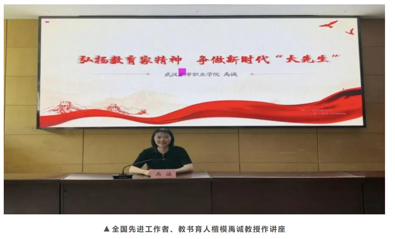 (通讯员 向越莲、李朝红)7月2日,“全国先进工作者”“全国教书育人楷模”“全国十大最美教师”“全国模范教师”“全国优秀教师”武汉城市职业学院机电工程学院院长禹诚教授以“弘扬教育家精神,争做新时代‘大先生’”为题,为通识学院全体教职工带来师德师风专题讲座。