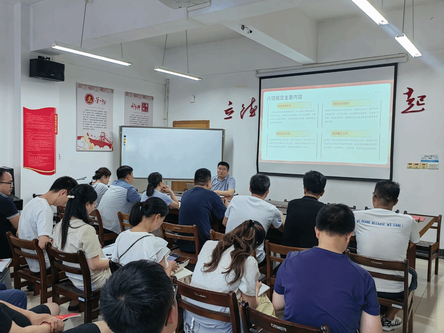 王中林围绕八项规定内涵、教师作风现状、解决思路等方面,结合教育实际,深入剖析主题,明确作风建设实践方向。他指出,八项规定不仅是行为约束,更是有深刻政治内涵的行动纲领,体现了党自我革命精神和从严治党实践,吃透八项规定精神是筑牢作风建设思想根基的关键。