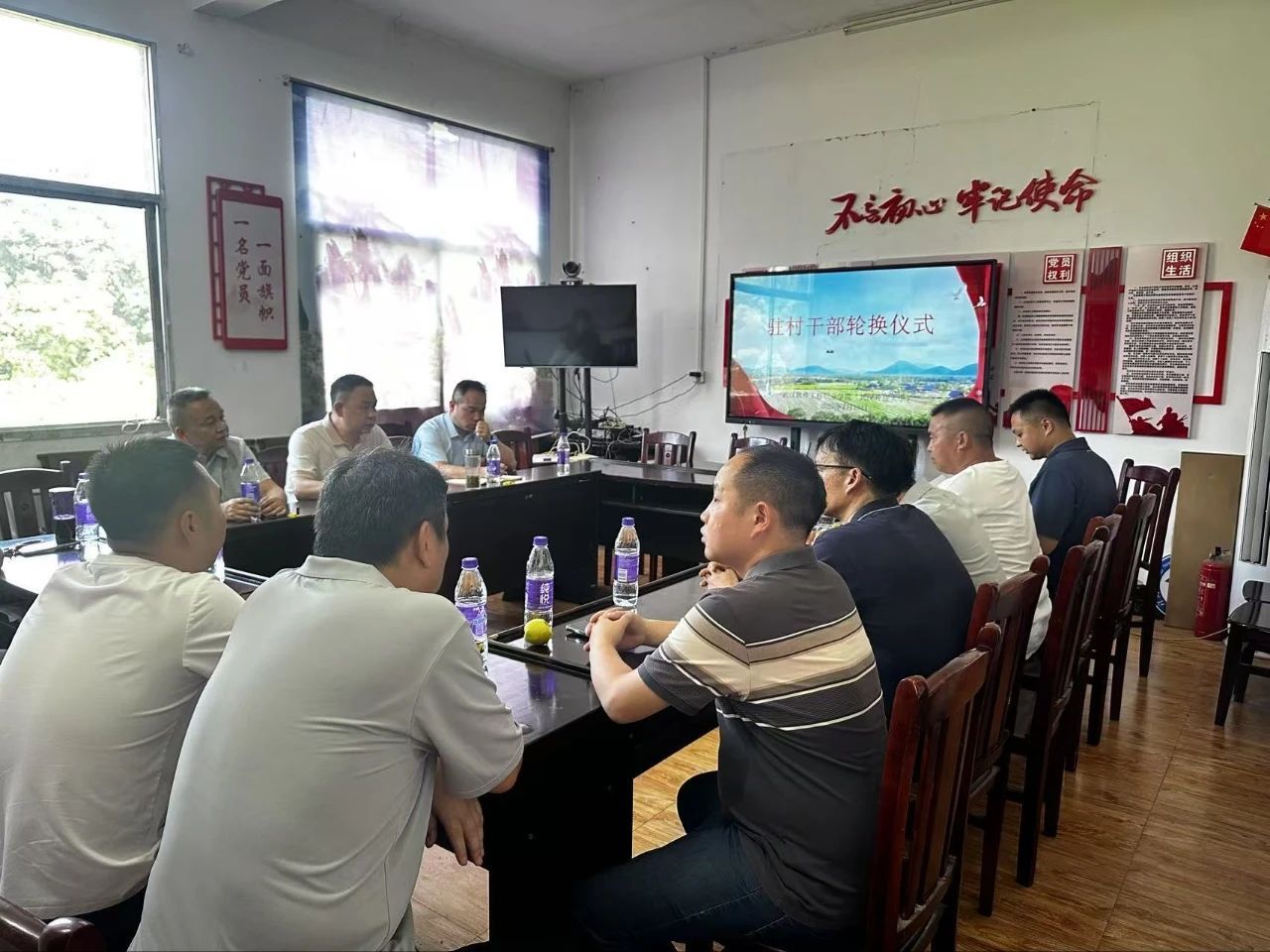 调研结束后,在村委会举行了驻村干部轮换仪式。原驻村工作队员李桐汇报了驻村工作成效与经验。接任队员黄海轮作表态发言,表示将恪尽职守、全力投入乡村振兴工作。