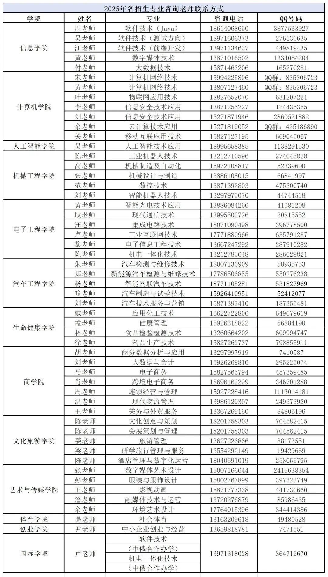 (二)招生专业咨询老师联系方式: