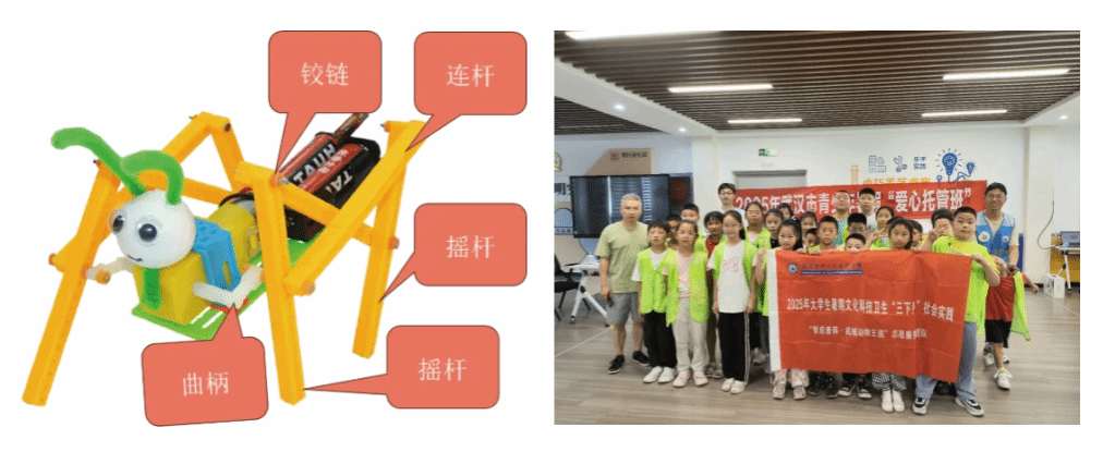 对32名志愿者而言,这更是一堂成长课。大一新生揭兴麟往返70公里赴蔡甸区授课,初到时面对拘谨的孩子,他蹲下身用 “蚂蚁小腿骨节” 比喻曲柄连杆机构,用演示激活课堂。当看到孩子们为机器人 “斗架” 欢呼时,他深有感触:“教育不是灌输,是用真诚点燃好奇。”