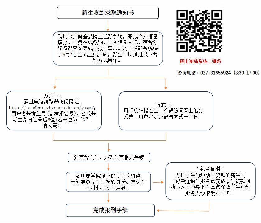 1.新生报到前,请登录考生所在省(市、自治区)教育厅招生网站或我校招生信息网站查询录取结果,核实录取通知书的真伪,谨防上当受骗。学校招生信息网网址:https://zsxx.whvcse.edu.cn