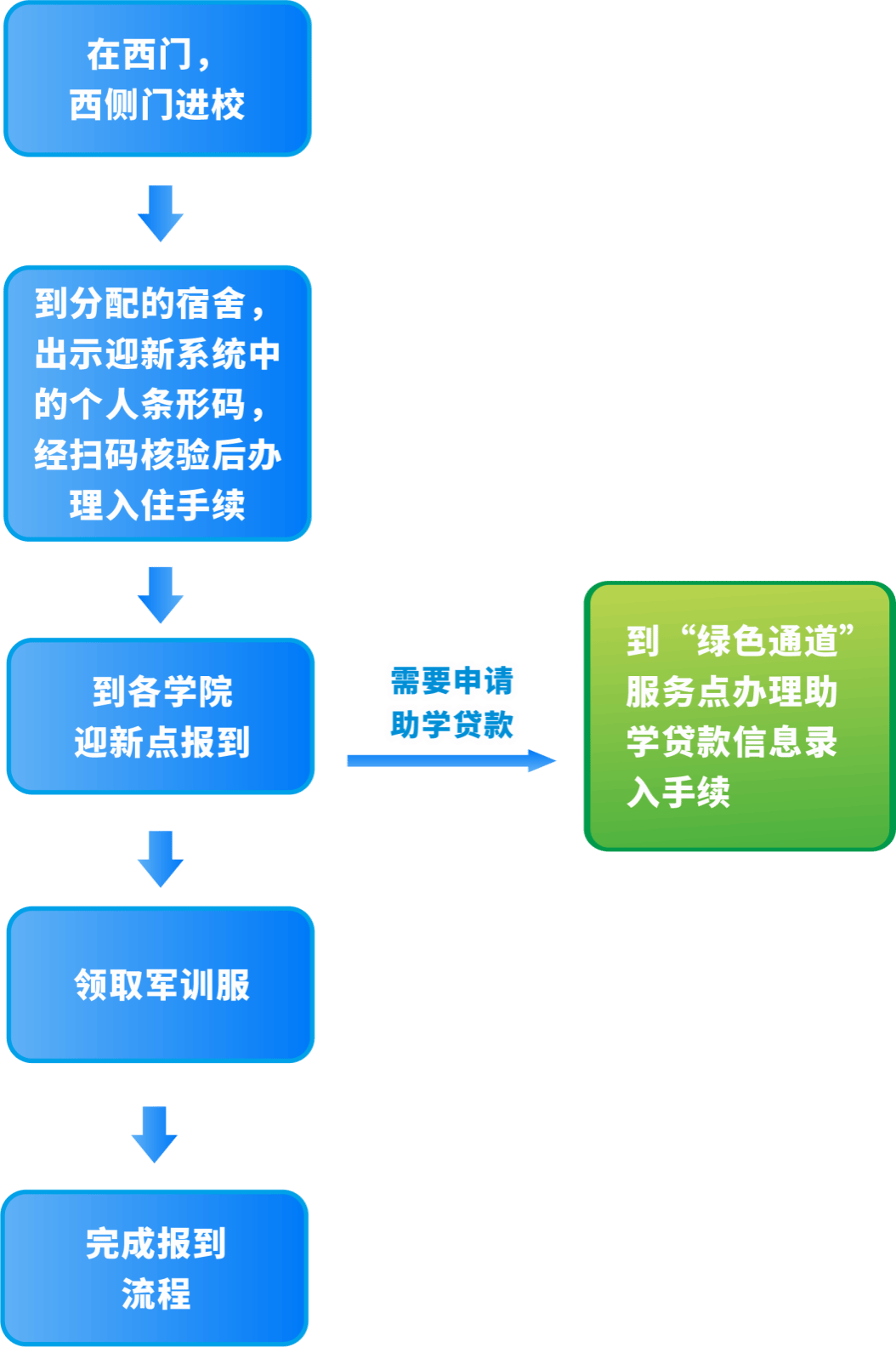 1.已申请了国家开发银行生源地信用助学贷款的新生在学院接待点完成报到手续后,携带《国家开发银行生源地信用助学贷款受理证明》(含回执校验码)前往学工部“绿色通道”服务点办理助学贷款信息录入手续;