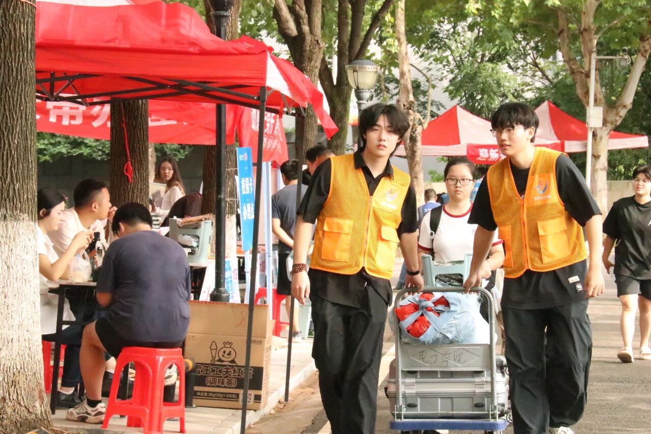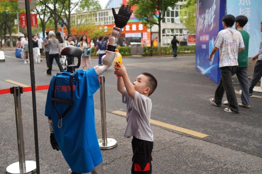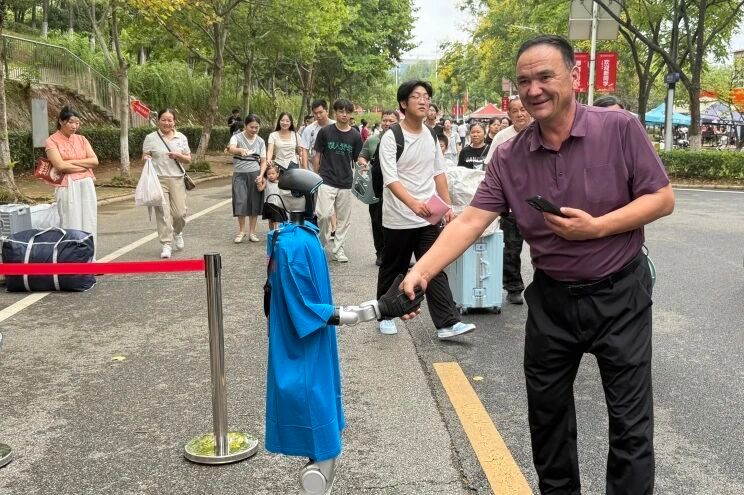 在电子工程学院的新生报到点,人形机器人与师生们热情挥手。