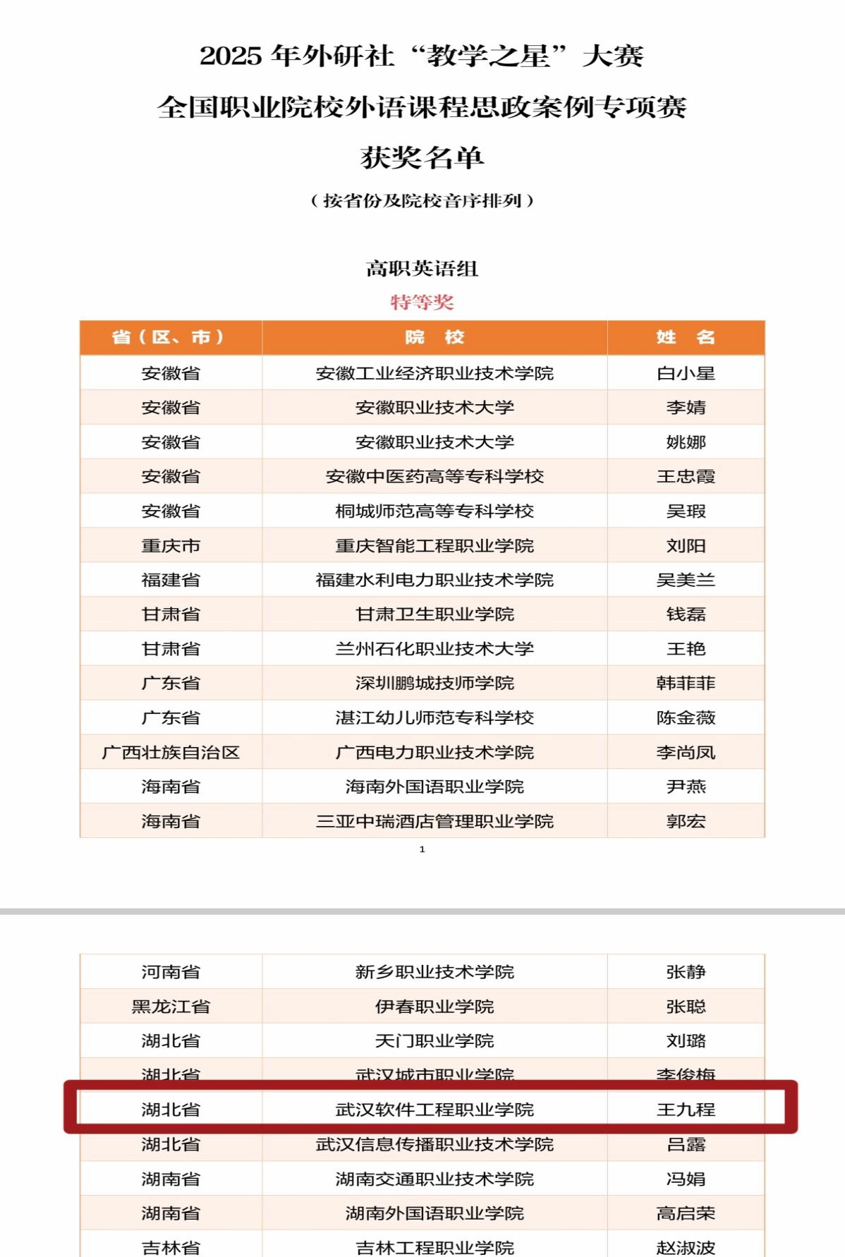 (通讯员 周婉)近日,2025年外研社“教学之星”全国职业院校外语课程思政案例大赛圆满落幕。我校教师表现突出,斩获多项佳绩:王九程荣获全国特等奖,周荷莲子、周婉分别荣获一等奖,李芳荣获二等奖,展现了学校在外语课程思政建设方面的创新实力。