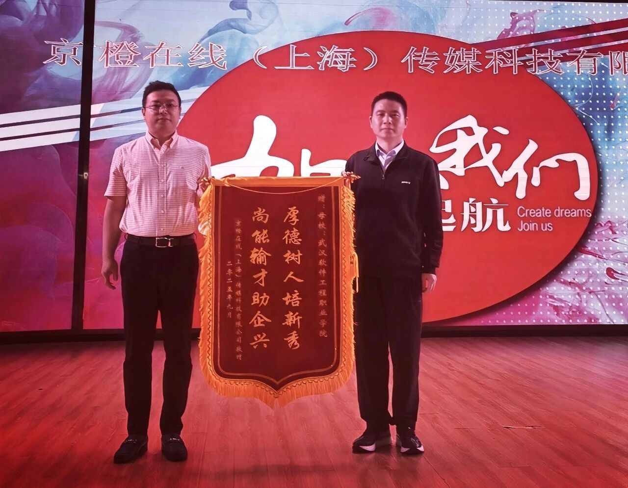 京橙在线(上海)传媒科技有限公司创始人、我校机械工程学院2010届校友王成龙此次专程回校招聘,把一面写有“厚德树人培新秀,尚能输才助企兴”的锦旗赠予母校。