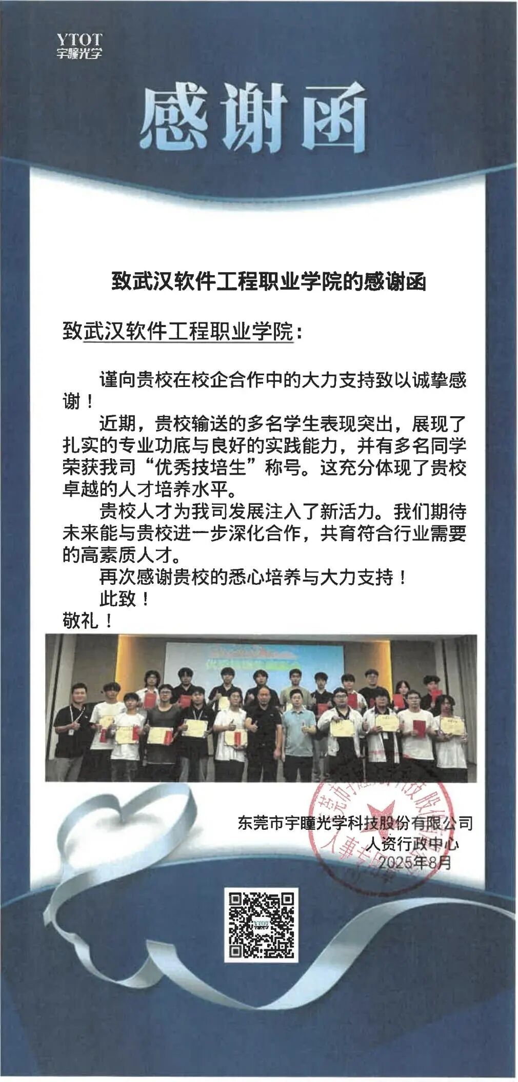 本次招聘会上,学校还收到了一份特殊的“礼物”——来自宇瞳光学的感谢函。来函中写道:“贵校输送的毕业生展现了扎实的专业功底和良好的实践能力,其中多名学生已荣获我司‘优秀技培生’称号。”这封感谢信,成为学校人才培养质量最有力的证明。