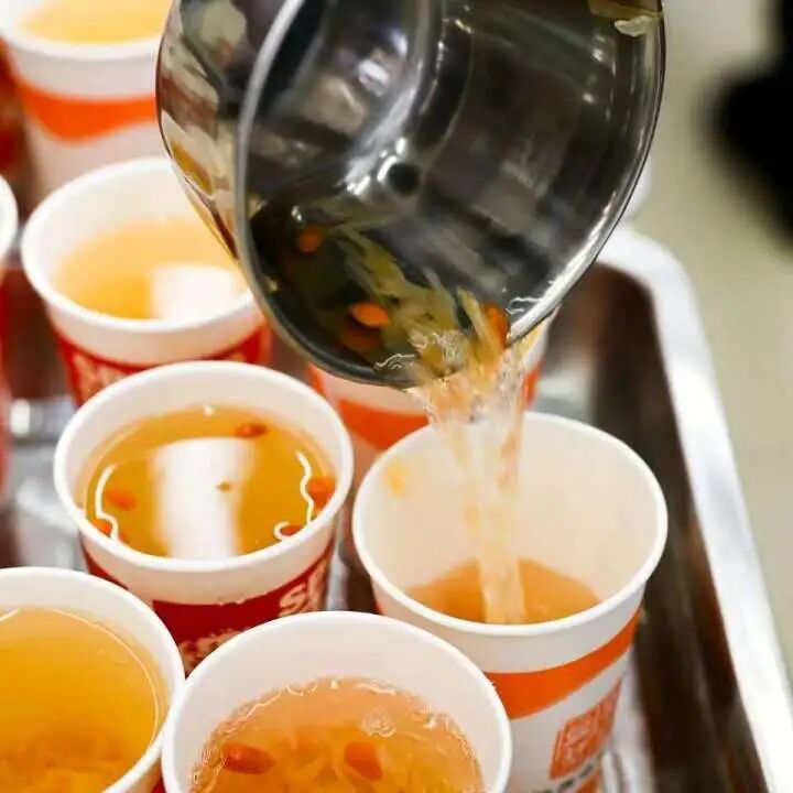 中午12点,食堂工作人员早早准备好免费的热柚子茶和金黄酥脆的炸鸡,诱人的香气弥漫在整个食堂区域。