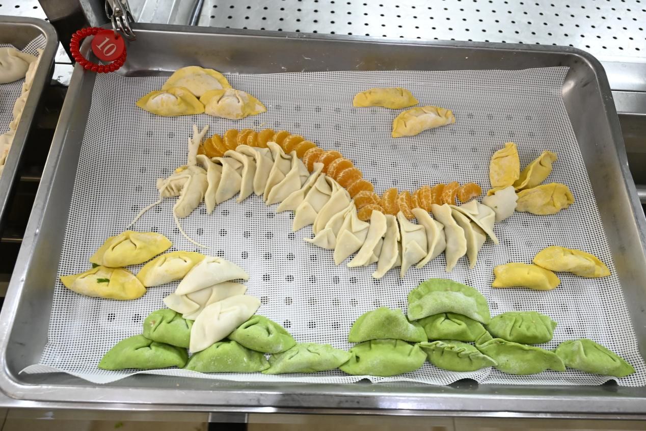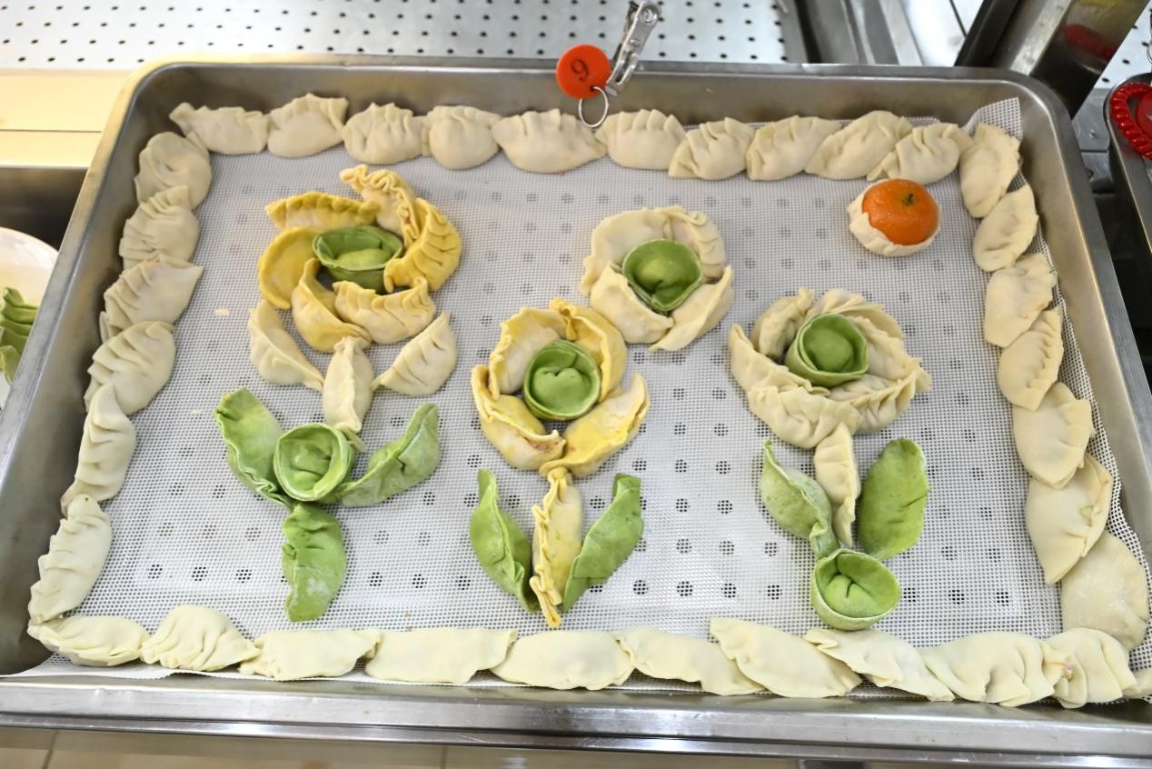 活动现场分为包饺子比赛和座谈交流两大环节。在包饺子比赛区域,11支师生代表队分工明确、配合默契。揉面、擀皮、包馅,动作娴熟者行云流水,新手小白们则在老师的耐心指导下认真学习,一个个形态各异、饱含心意的饺子很快堆满了餐盘。各代表队充分发挥创意,精心调配出各具风味的特色馅料,同学们巧手翻飞,创作出元宝饺、月牙饺、麦穗饺等各式造型的饺子。