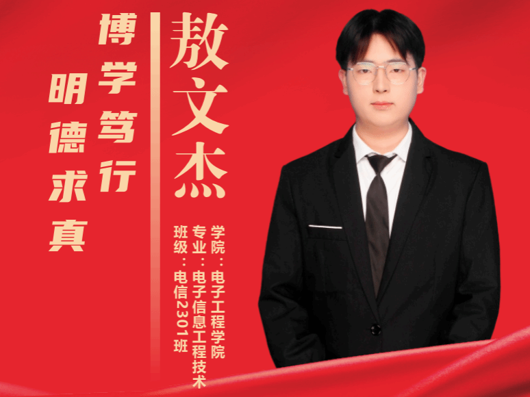 他是学校优秀志愿者,学院优秀共青团员。他求真务实,两年多来获得国家级、省级奖项5项,校级奖项4项。他刻苦奋进,专业课成绩90+,专业排名名列前茅。 他热心奉献,在校期间积极参加志愿服务。未来,他将在热爱的领域不断钻研,为建设祖国奉献他的力量!