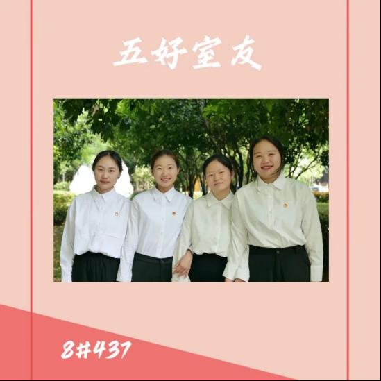 8栋437寝室由来自社会体育1901班吴娜、李颖、张傲雪和服装设计2001班李晓晓组成。虽然学院专业年级不同,但她们和谐友爱,互相分享自己的专业特长,一起跑步、打球、剪裁服装等。室友上场比赛时,为她加油喝彩;室友拿回设计作品时,踊跃试穿;室友受伤不便时,照顾她的生活起居。她们都是学院的团学干部,积极为同学们服务;她们共同获得奖学金,成绩平均分达88.4分;她们积极参与各项活动,还多次代表学校参赛,获得省市级奖项11项。
