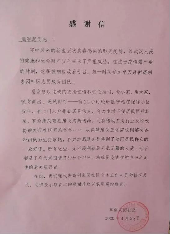 近日,卓刀泉街道高创家园社区书记柳晶、副主任罗桂香送来一面光荣的锦旗,感谢我校机关五党支部党员熊继彪为社区防疫做出的贡献。