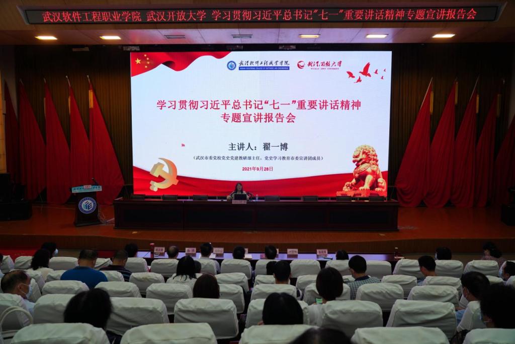 (通讯员:周中南 赵珊)为深入学习贯彻习近平总书记在庆祝中国共产党成立100周年大会上的重要讲话精神,推动我校党史学习教育深入开展,9月28日下午,学习贯彻习近平总书记“七一”重要讲话精神专题宣讲报告会在1号厅举行,市委党校党史党建教研部主任、党史学习教育市委宣讲团成员翟一博副教授作专题报告。校党委理论学习中心组全体成员、全校科级以上干部和辅导员代表参加学习。报告会由党委书记马蜂主持。