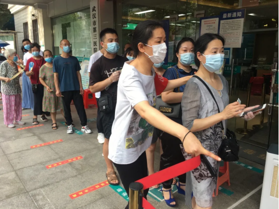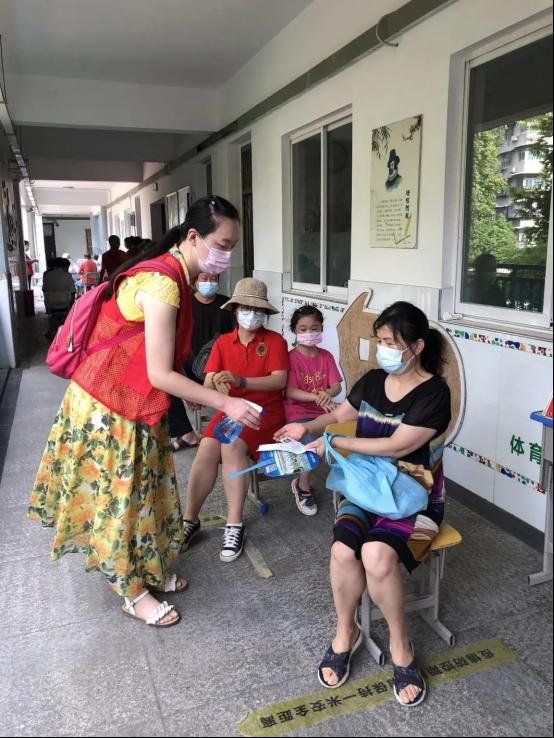“我只想尽一份力,尽可能减轻社区的负担,共同守护好武汉这座家园”,接到紧急通知后,李莉老师第一时间到岗。她一边给每位居民进行酒精消毒,一边说:“十人一组,很快!请大家坐好,准备好身份证,注意保持一米间距。”遇到腿脚不便坐轮椅的老年人,她赶紧上前帮忙;遇到检测呕吐的老年人,她赶紧送上纸巾……连续多小时高强度紧张工作,大家都没有一句怨言,累了渴了,喝口水坐一会儿,又继续穿梭不停。“天气炎热,辛苦了,谢谢你们”,居民简单朴实的话语让她很是感动。她说:“遇到给我们送水和冰块的居民,心里更是暖暖的。”