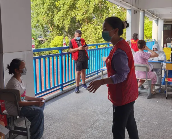 下沉党员服从社区防疫工作,晚班值守到晚上10点钟,冒着酷暑高温,克服诸多困难,坚守社区疫情防控阵地,协助做好核酸检测、卡口值守。