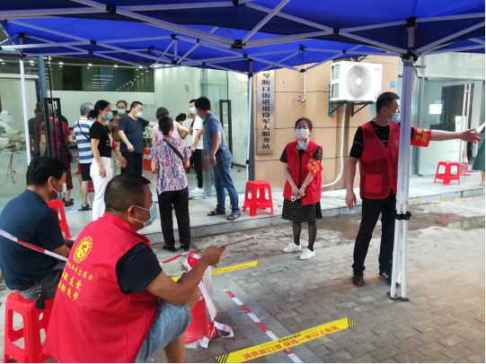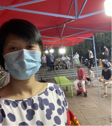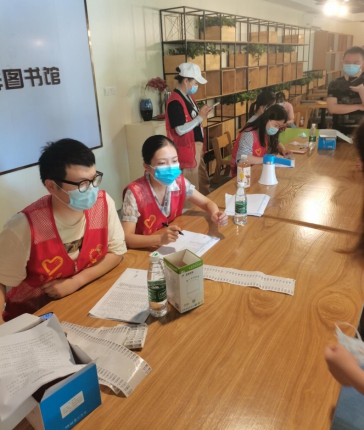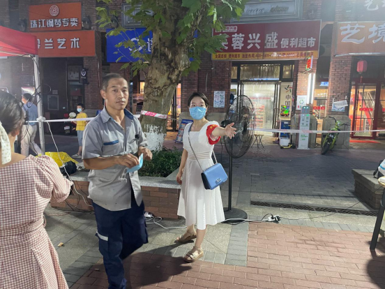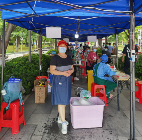 程伟老师是最早下沉的一批党员同志,8月3日晚18点她就准时到达采集点现场维持秩序。由于医护人员紧缺,原定两个采集点只能合并为一个采集点,居民们一下蜂拥过去。程伟老师和下沉的党员们手拉手拦住人群,大声地向居民们解释,耐心地劝导大家排队等候,不时提醒大家保持安全间距,并且为70岁以上的老人、未办理身份证的儿童开辟快速检测通道……一直持续到晚上23点,协助完成检测1500余人,程老师衣服汗湿了一遍又一遍,嗓子早已嘶哑。