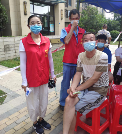 罗珺老师所在的江汉区水仙里社区疫情防控形势十分严峻,离家不到200米的小区已封闭一周。接到社区发起的通知后,她第一时间报名,从炎热的下午3点开始一直服务到晚上8点,为排队的居民逐个测量体温,做好情绪疏导工作,并搀扶行动不便的老人办理检测手续。作为马院的一名党员教师,她说:“要对得起胸前佩戴的这枚党员徽章,时刻坚守防疫第一线”。