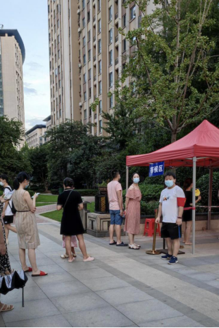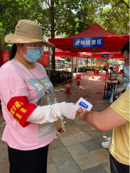 8月4日,全市全员核酸检测第一天,蔡首哲、李灿两位老师当晚上岗。他们来到谷尚居社区,为排队等候检测的市民测量体温,努力维持现场秩序。