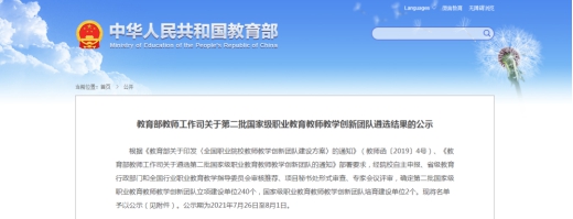 根据《教育部关于印发〈全国职业院校教师教学创新团队建设方案〉的通知》(教师函〔2019〕4号)、《教育部教师工作司关于遴选第二批国家级职业教育教师教学创新团队的通知》部署要求,经院校自主申报、省级教育行政部门和全国行业职业教育教学指导委员会审核推荐、项目秘书处形式审查、专家会议评审,确定第二批国家级职业教育教师教学创新团队立项建设单位240个,国家级职业教育教师教学创新团队培育建设单位2个。