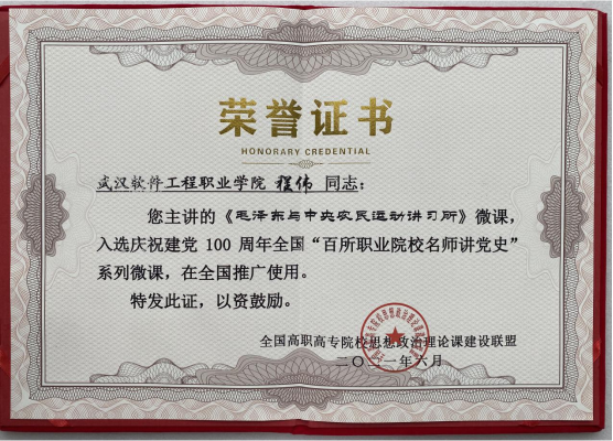 (通讯员:叶玉姝)近期,全国高职院校“喜庆建党百年”百名名师讲党史总结大会在延安职业技术学院举行,大会公布庆祝建党100周年全国“百所职业院校名师讲党史”系列微课入选名单。我校马克思主义学院程伟副教授的《毛泽东与中央农民运动讲习所》党史学习教育微课成功入选,并将在全国推广使用。