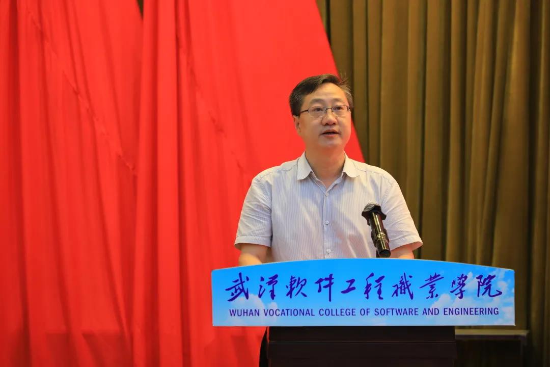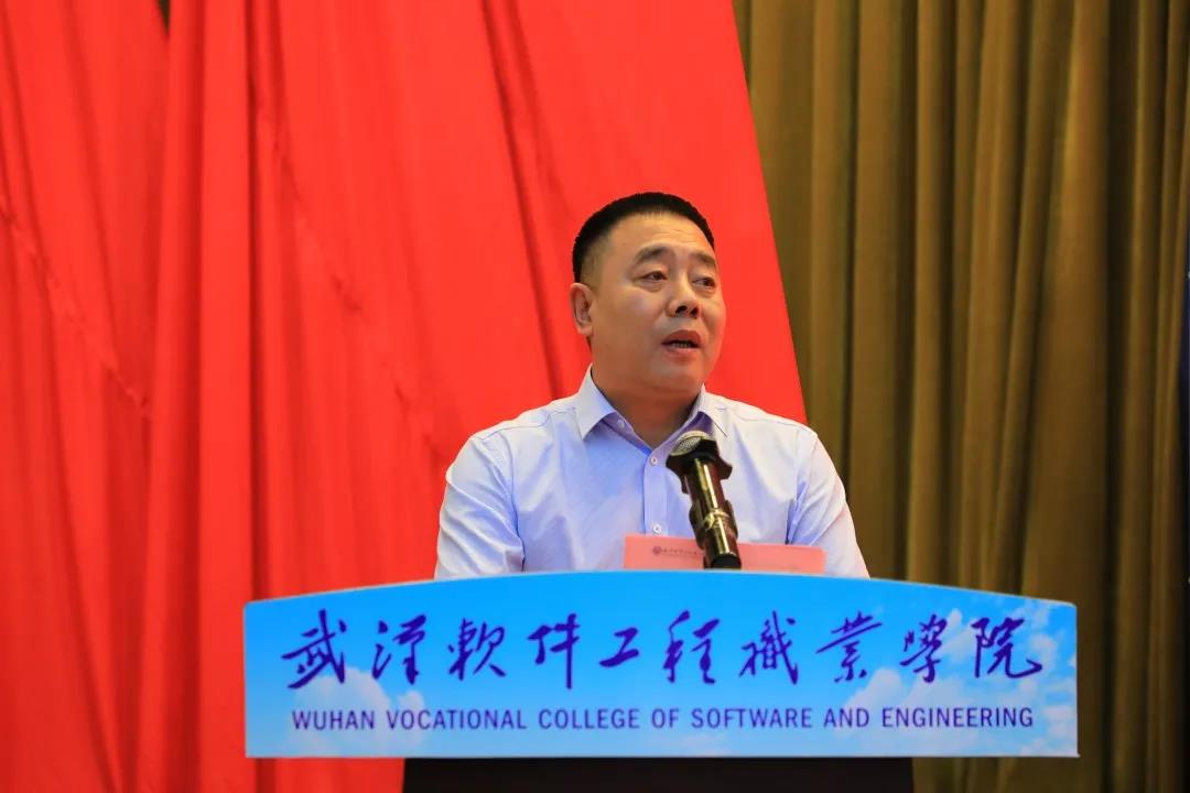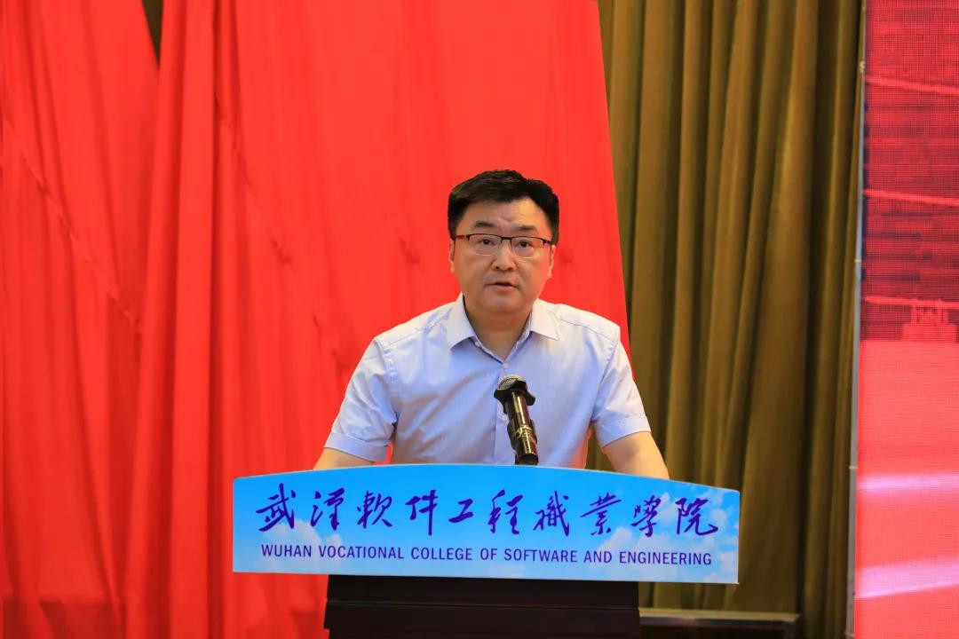 武汉市人民政府副秘书长李涛讲话。他代表武汉市政府衷心感谢教育主管部门对大赛的支持指导与对承办单位的青睐信任。他指出,武汉是全国重要的工业基地、科教基地和综合交通枢纽,武汉软件工程职业学院坐落在被称为“智慧之光,财富之谷”的“中国光谷”东湖高新技术开发区,这里汇聚着国家存储器基地、大健康产业基地、集成电路产业、光电子信息产业、数字产业及5G产业链,为职业教育办学提供了良好的生态环境和发展氛围。此外,武汉科教实力雄厚,是全国三大智力密集区之一,为加快构建现代职业教育体系提供了实践基础。他希望,学校以办好全国一流赛事为契机,向优秀兄弟院校学习经验,不断提升职业教育办学水平和人才培养质量,让远道而来的宾客在武汉、在武软收获值得回忆的参赛经历,载誉而归。