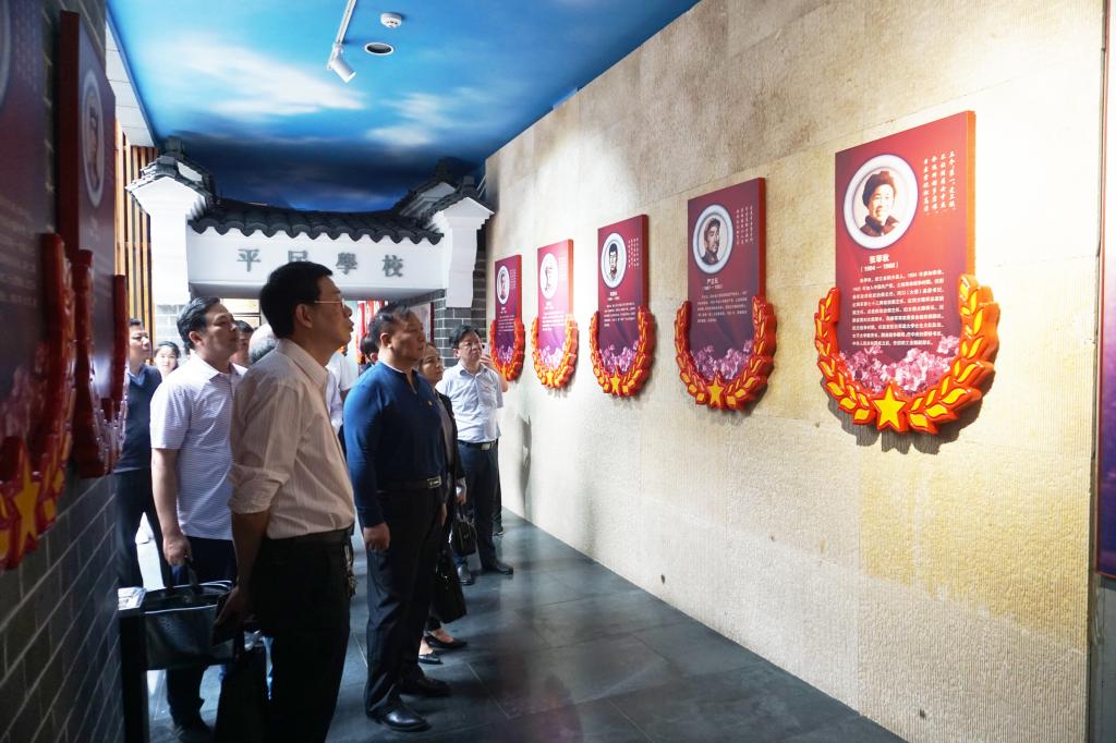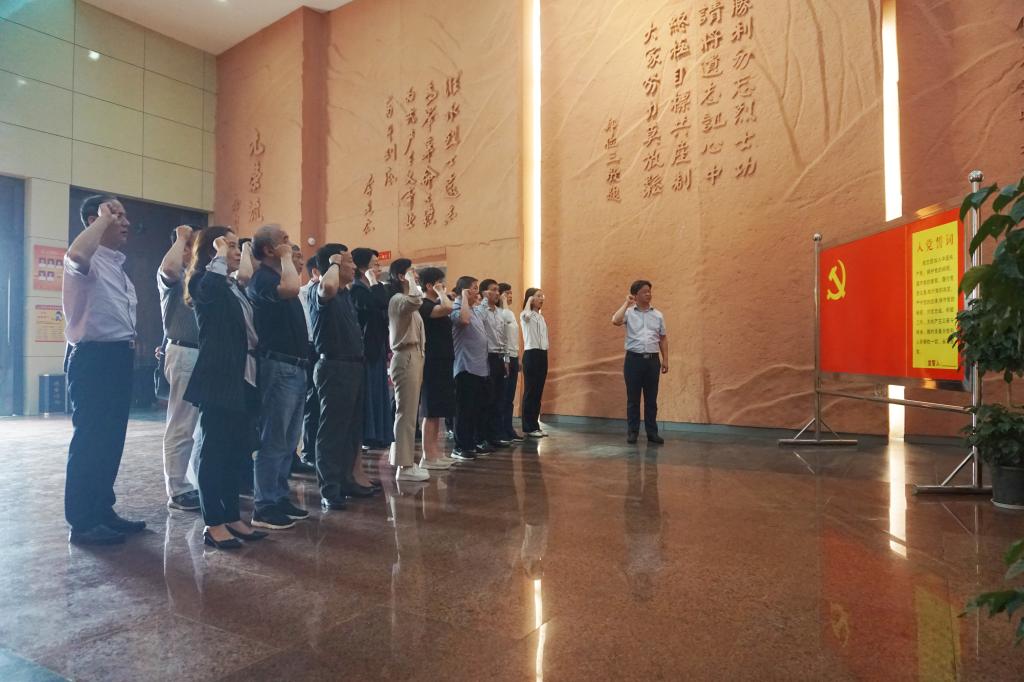 一行人跟随讲解员参观革命烈士纪念馆,了解了土地革命、抗日战争和解放战争时期鄂豫边区革命先烈的生平事迹,先烈们为追求革命胜利、人民解放而英勇斗争的艰辛历程和丰功伟绩鼓舞着在场每一位党员干部。党员干部们在纪念馆大厅内面对党旗,举起右拳,重温入党誓词,印刻着初心使命的誓言,激励着大家牢记历史、拼搏奋斗。
