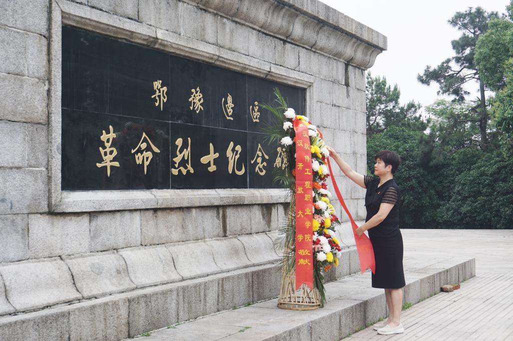 参加活动的党员干部们来到鄂豫边区革命烈士陵园,在纪念碑四周的山坡上,树木郁郁葱葱,虫鸣鸟叫。大家在庄严的纪念碑前向革命先烈敬献花篮,副校长杨京湘上前整理花篮。党员干部在纪念碑前三鞠躬,致敬英雄,缅怀先烈。