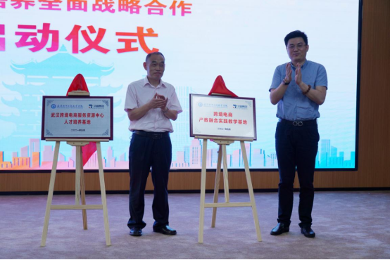 校长刘前信、硚口区副区长张智为“武汉跨境电商服务资源中心人才培养基地”揭牌