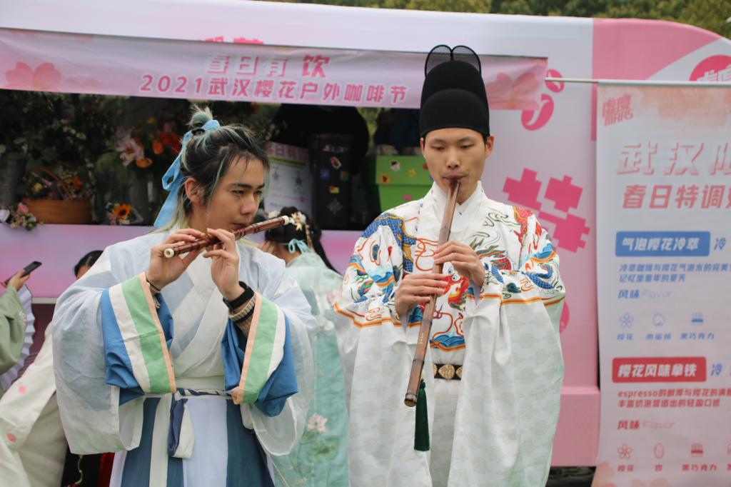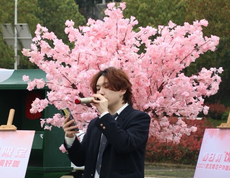 “樱花”不仅开在校外,当天下午,赏樱活动在校内举行,除了可以免费领取的春日特饮咖啡,活动还开设文艺表演、汉服体验、抖音赏樱挑战赛等互动,吸引了不少师生前来参与。