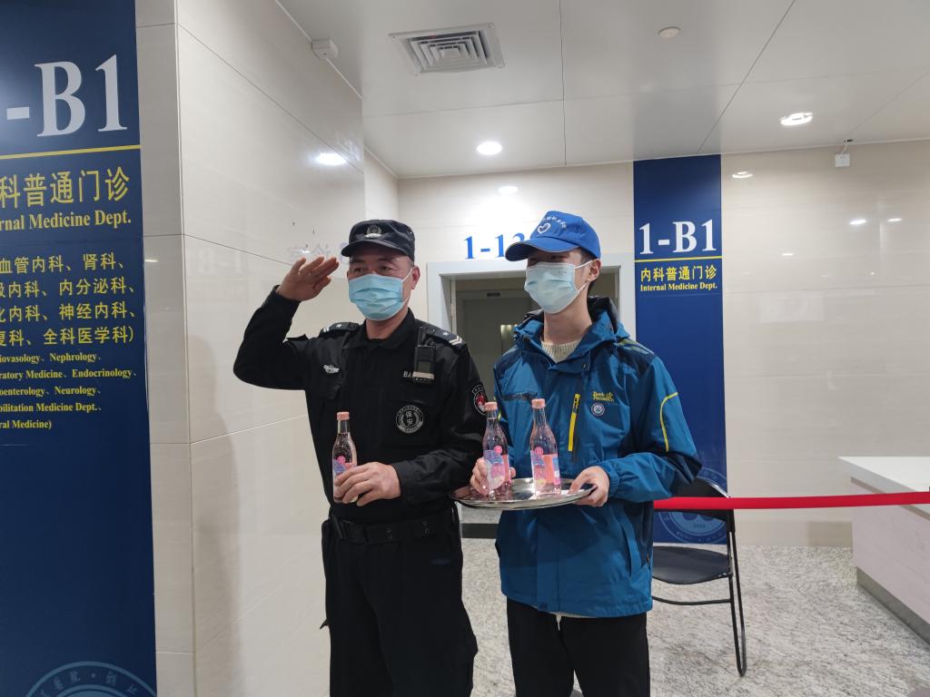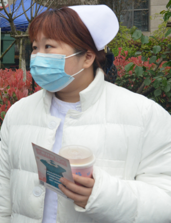志愿者端过一杯杯“樱花拿铁”咖啡和“樱花饮料”,双手呈递到医护人员手中,伴随一声声“谢谢,您辛苦了”和一张张小卡片,志愿者们将感谢和祝福也送进医护人员心中。